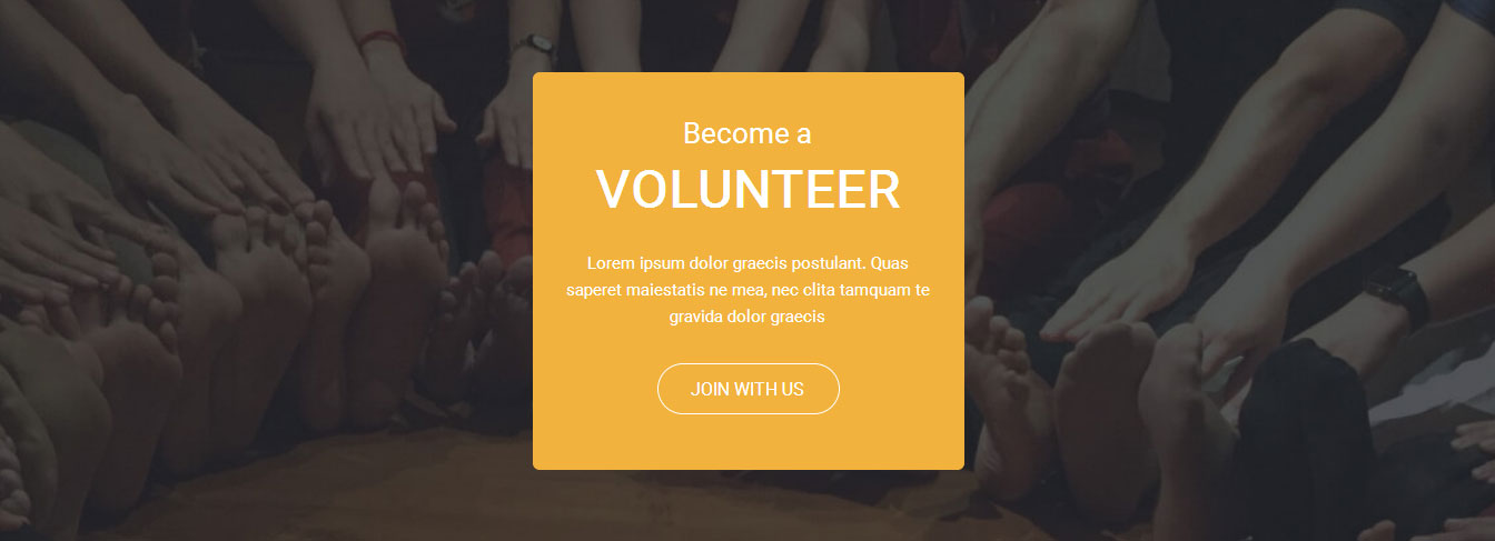 Shortcode/Content:<h3><span>Become a</span> Volunteer</h3> <p>Lorem ipsum dolor graecis postulant. Quas saperet maiestatis ne mea, nec clita tamquam te gravida dolor graecis</p>[border-button align="center" name="Join with us" link="#" target=""]