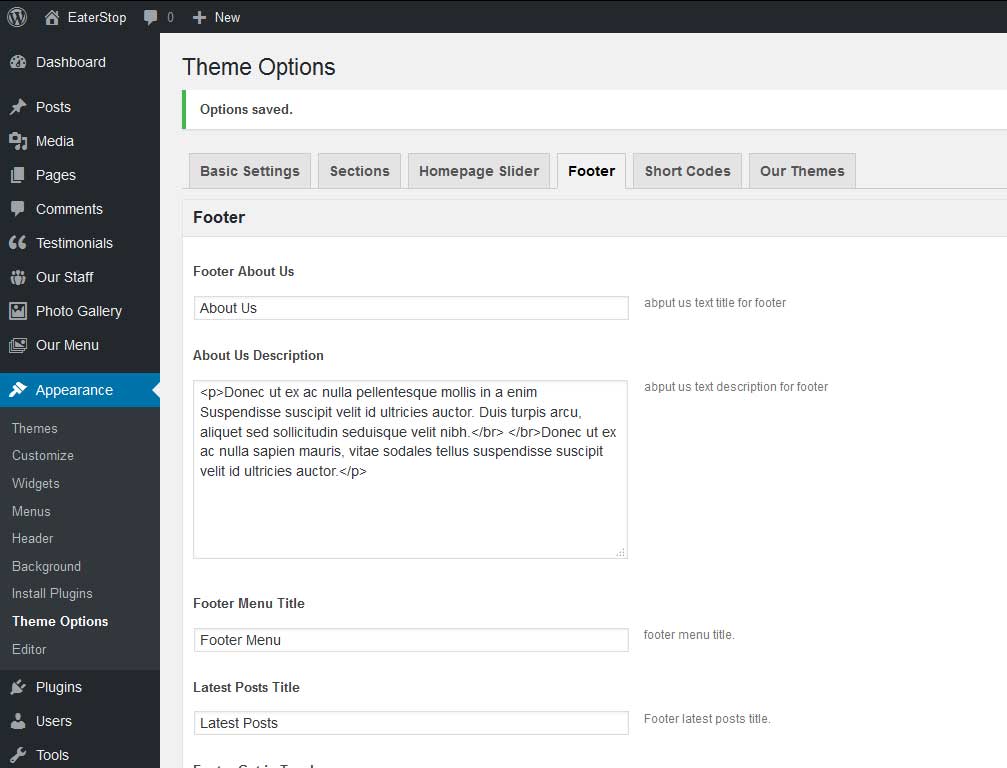 To manage footer section go to the Appearance » Theme Options » Footer