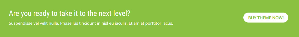 Shortcode/Content:[promobox bgcolor="#89c140" titlecolor="#ffffff" color="#ffffff" buttonbgcolor="#ffffff" buttoncolor="#89c140" promotitle="Are you ready to take it to the next level?" button="BUY THEME NOW!" url="#"]Suspendisse vel velit nulla. Phasellus tincidunt in nisl eu iaculis. Etiam at porttitor lacus.[/promobox]